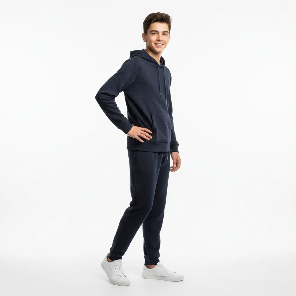 استمتع بمظهر رياضي أنيق مع هذا الزي المكون من سترة بغطاء ورجالي مريح. مصنوع من قماش ناعم عالي الجودة بلون أزرق داكن، يوفر لك شعورًا بالراحة والحرية في الحركة. يأتي مع تفاصيل متطورة مثل الجيب الأمامي وسحب السحاب، إضافة إلى تصميم عصري يناسب جميع الأوقات. يعتبر هذا الزي مثالياً للاستخدام اليومي، سواء كنت تتوجه إلى الصالة الرياضية أو تقوم بنشاطات خارجية.